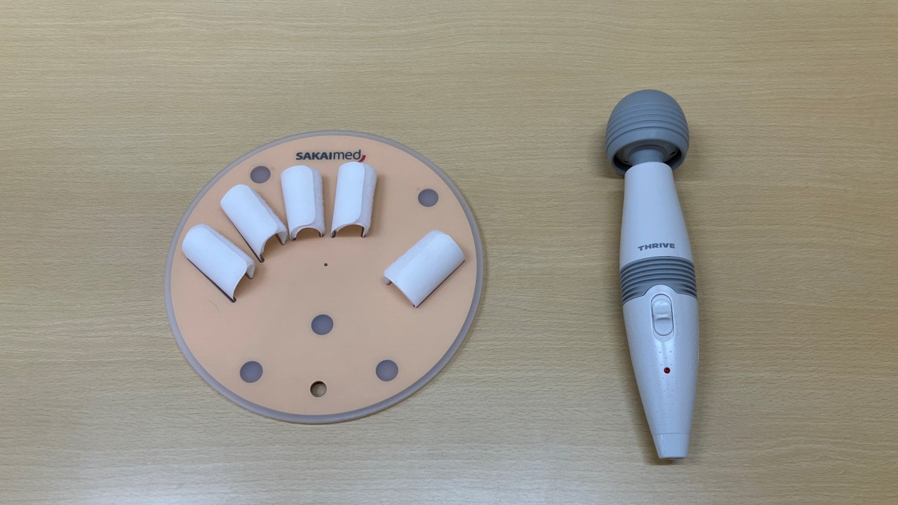 手指ストレッチボードによる持続伸張(最長15分)やハンディマッサージャーによる振動刺激(90-100Hzの周波数で数分)を使用し、筋肉の状態を整えた上でトレーニングを開始します。